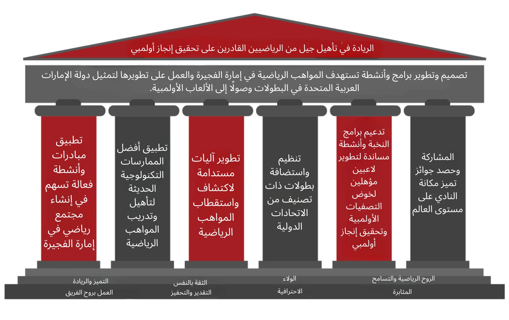 إعداد وتطوير المواهب الرياضية المقاتلة في الفجيرة لتمثيل دولة الإمارات العربية المتحدة إقليميًا وعالميًا، من خلال توفير بيئة رياضية متكاملة تُعزز من قدراتهم البدنية والفكرية، وترسخ قيم الولاء والانتماء، بما يسهم في صناعة أبطال قادرين على المنافسة في مختلف المحافل الرياضية وتحقيق إنجازات أولمبية ترفع اسم الدولة عاليًا.
